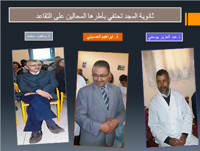سيرا على نهجها، نظمت ثانوية المجد التأهيلية بالمديرية الإقليمية لإنزكان أيت ملول، السبت الماضي، حفلا تكريميا لفائدة الأطر التربوية بالمؤسسة المحالة على التقاعد برسم سنة 2016 عرفاناً بالمجهودات التي بذلتها والتضحيات التي قدمتها خلال مسيرتها المهنية الغنية بالعطاءات. ويتعلق الأمر بالأستاذين ابراهيم الحسيني (مدير المؤسسة) وعبد العزيز يوسفي (أستاذ اللغة الإنجليزية) اللذان استفادا من التقاعد النسبي، بالإضافة الى الأستاذ محمد ساهب (الحارس العام للخارجية)، والذي استكمل السن القانونية للتقاعد غير أن الوزارة الوصية قررت الإبقاء والاستفادة من خدماته الى غاية نهاية الموسم الحالي.