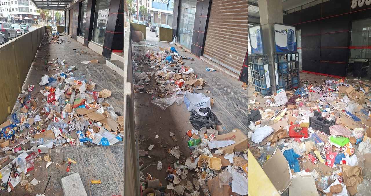 ووثقت صور متداولة على مواقع التواصل الاجتماعي تكدس الأزبال على مقربة مجموعة من المحلات، مما ينعكس سلبا على صورة الحي الذي يعد من أبرز الفضاءات الحديثة بالمدينة.