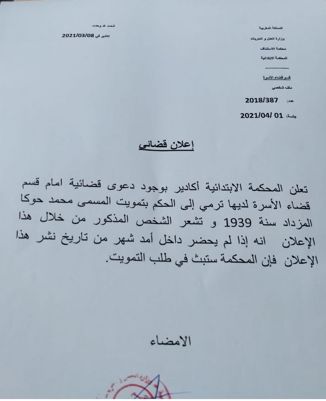 وجدير بالذكر ان المحكمة الابتدائية باكادير ، اعلنت بتاريخ 8 مارس 2021 ،في ملف 2018/387 ؛بوجود دعوى قضائية امام قسم قضاء الاسرة لديها، ترمي الى الحكم بتمويت محمد حوكا ،وتشعره انه اذا لم يحضر داخل امد شهر ،فان المحكمة ستتبث في طلب التمويت .