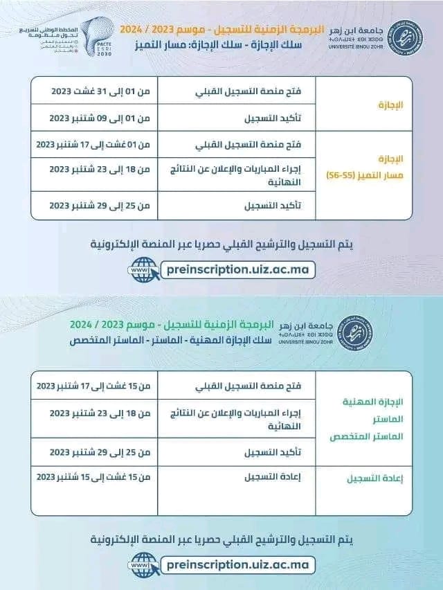 أكادير : البرمجة الزمنية للتسجيل في سلكي الإجازة و الماستر بجامعة ابن زهر بأكادير موسم 2023/2024. أكادير والجهات بن عيسى - أكادير- الأحد 6 أغسطس 2023 - 20:05 تم الكشف عن البرمجة الزمنية للتسجيل في سلكي الإجازة و الماستر بجامعة ابن زهر بأكادير موسم 2023/2024 كما يلي : شارك هذا المحتوى فيسبوك X واتساب تلغرام لينكدإن نسخ الرابط الإجازة و الماستر بجامعة ابن زهر بأكادير