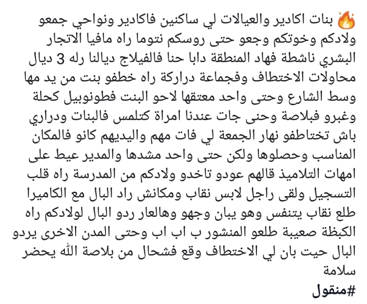 خلف خبر انتشار مافيا الاتجار في البشر و اختطاف الأطفال، الرعب و الجدل لدى عدد من الأسر بأكادير، على خلفية تداول أنباء في مواقع التواصل الاجتماعي تفيد تواجد شبكة منظمة بالمدينة و الضواحي تنشط في اختطاف و احتجاز الأطفال.