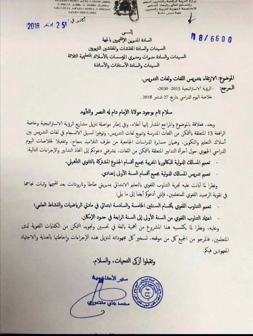 أصدرت الأكاديمية الجهوية للتربية والتكوين جهة سوس ماسة مراسلة تحت رقم 6600/18 بتاريخ 25/10/2018 مرجعيتها الرؤية الاستراتيجية لإصلاح التعليم وخلاصة اليوم الدراسي بتاريخ 27/09/2018 ،تم تداولها على صفحات التواصل الاجتماعي.