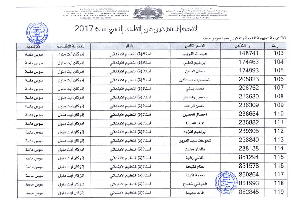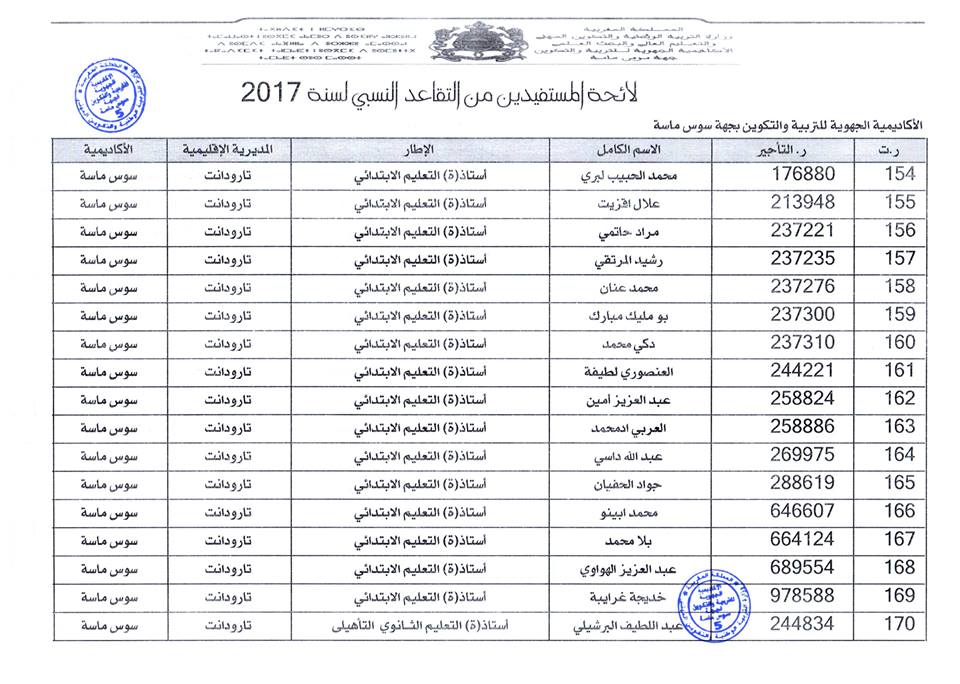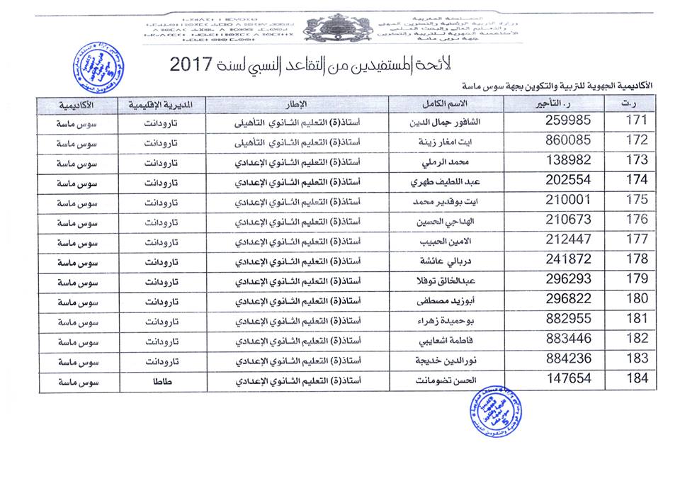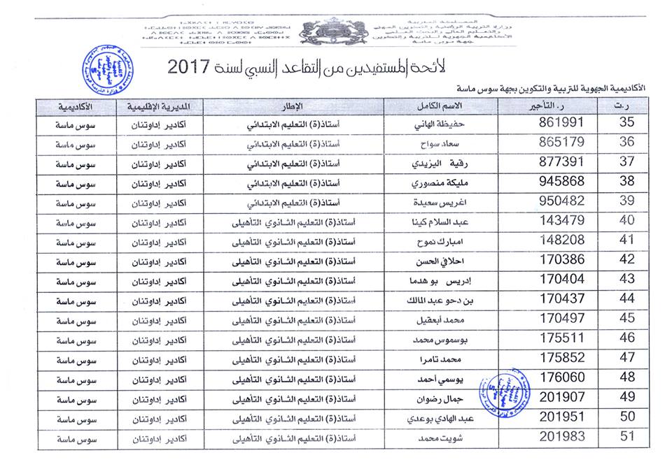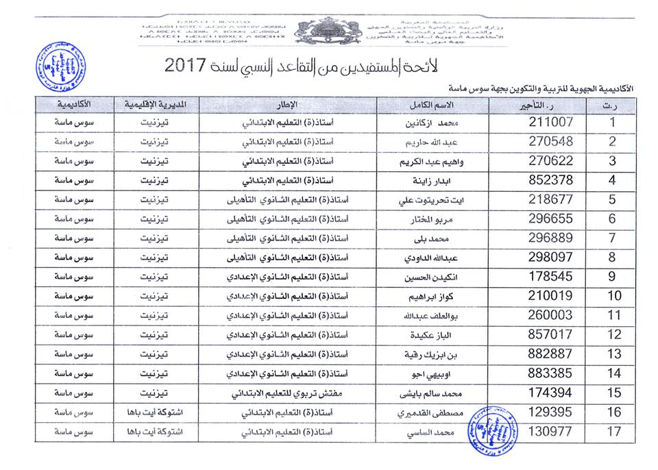 افرجت وزارة التربية الوطنية على لائحة المستفيدين من التقاعد النسبي بجهة سوس ماسة، وسيستفيد المعنيون والمعنيات من هذا الحق ابتداء من فاتح شتنبر 2017 ، وبلغ عدد المستفيدات والمستفيدين: 184 مع تسجيل أكبر نسبة بكل من المديرية الاقليمية أكادير اذا وثنان والمديرية الاقليمية انزكان أيت ملول