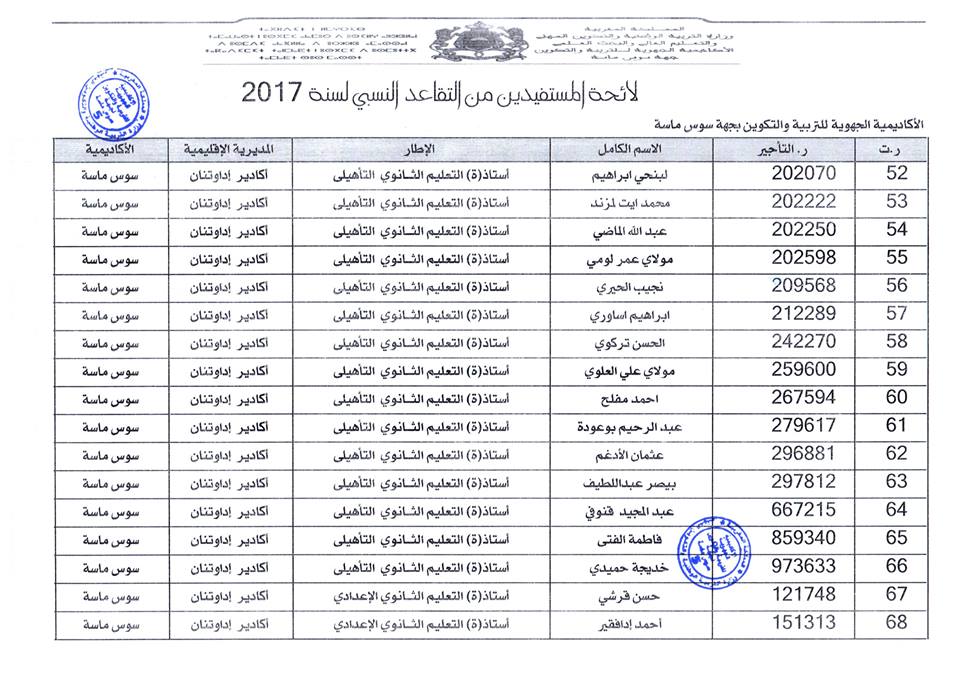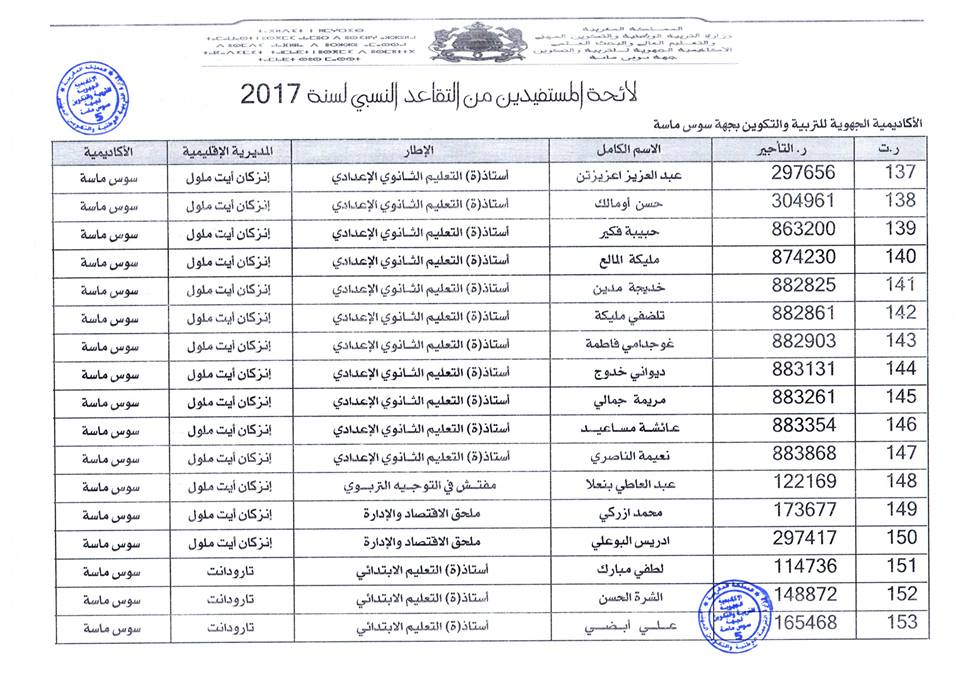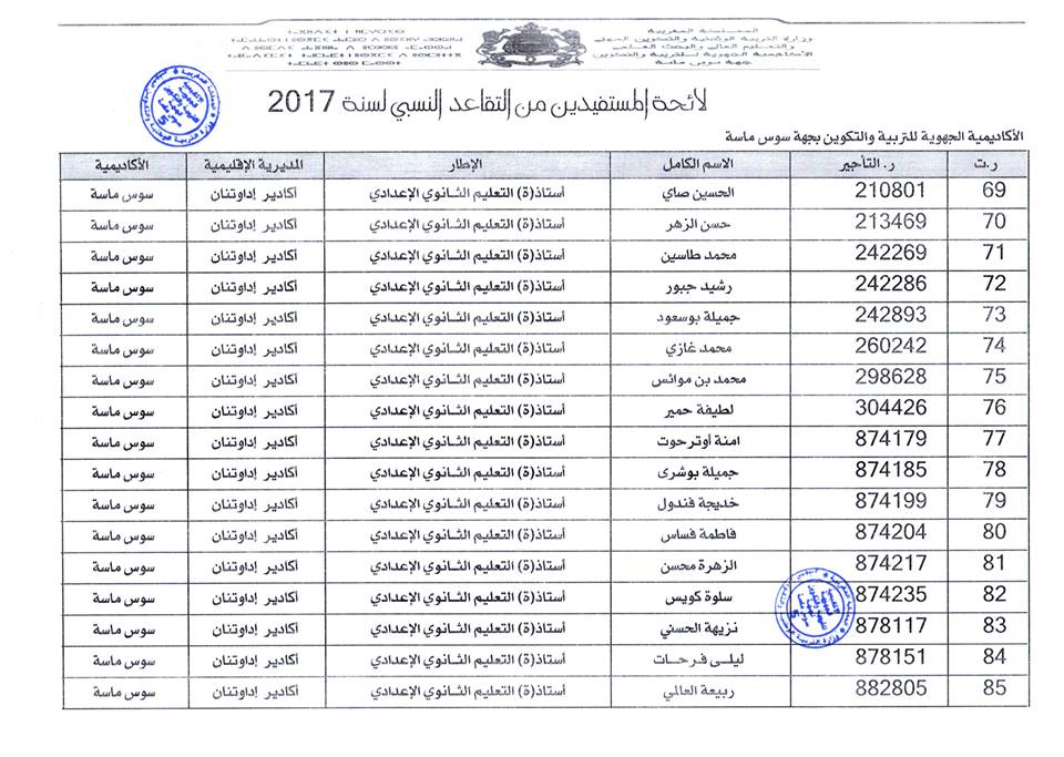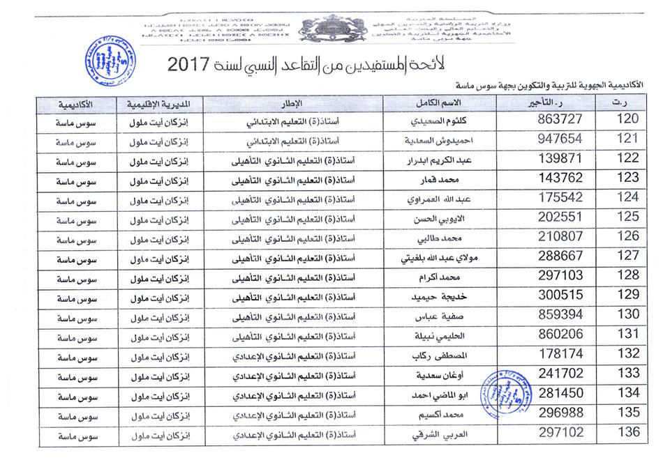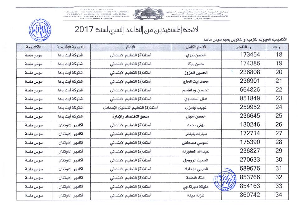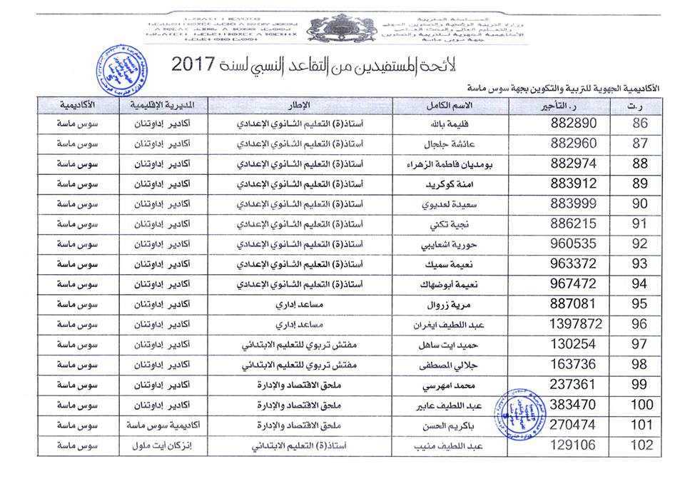 افرجت وزارة التربية الوطنية على لائحة المستفيدين من التقاعد النسبي بجهة سوس ماسة، وسيستفيد المعنيون والمعنيات من هذا الحق ابتداء من فاتح شتنبر 2017 ، وبلغ عدد المستفيدات والمستفيدين: 184 مع تسجيل أكبر نسبة بكل من المديرية الاقليمية أكادير اذا وثنان والمديرية الاقليمية انزكان أيت ملول