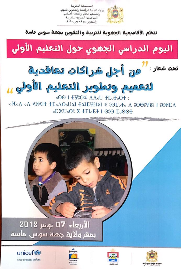 تحتضن الأكاديمية الجهوية للتربية والتكوين لجهة سوس ماسة أشغال اليوم الدراسي الجهوي حول التعليم الأولي” تحت شعار: “من أجل شراكات تعاقدية لتعميم وتطوير التعليم الأولي”، وذلك يوم الأربعاء 07 نونبر 2018 بمقر ولاية جهة سوس ماسة بدءا من الساعة التاسعة صباحا.