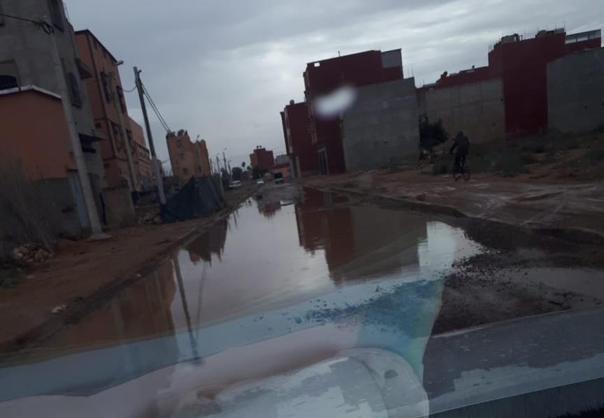 بيد أن أمطار الخير والبركة كشفت عن عيوب بالبنية التحتية للمنطقة التي تقطن بها ساكنة مهمة، ومن أبرز هذه العيوب، الطريق الرئيسية المؤدية الى العديد من المنازل التي تحولت بين عشية وضحاها، إلى مسبح ممتلئ بالمياه (الصورة ).