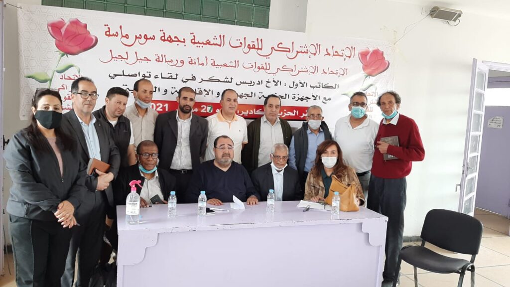 تحت شعار:”الإتحاد الإشتراكي للقوات الشعبية أمانة ورسالة جيل لجيل” عقد الكاتب الأول إدريس لشكر،بمقر الحزب بأكَادير،لقاءات حزبية تواصلية مكثفة مع الأجهزة الجهوية الحزبية والإقليمية والمحلية بجهة سوس ماسة يومي 26 و27 مارس 2021 وذلك بحضور أعضاء المكتب السياسي محمد بنعبد القادر وبديعة الراضي ونزهة أباكريم والمهدي مزواري.