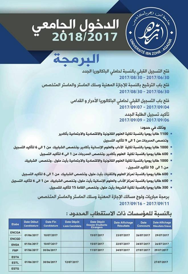 إعلان مهم من جامعة ابن زهر خاص بالطلبة الجدد الحاصلين على الباكالوريا أكادير والجهات بن عيسى - أكادير- الخميس 22 يونيو 2017 - 00:50 شارك هذا المحتوى فيسبوك X واتساب تلغرام لينكدإن نسخ الرابط