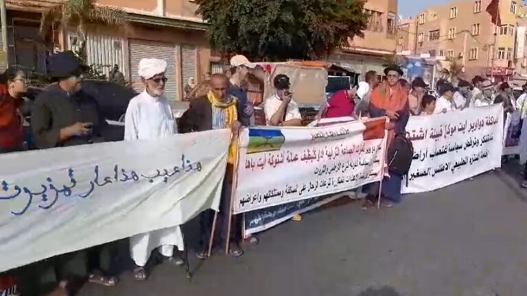 وردد المحتجون خلال هذه الوقفة التي دعت إليها جمعية “أكال للدفاع عن أراضي الأجداد بسيدي بيبي وأيت عميرة” شعارات من قبيل “صامدون صامدون على حقوقنا مناضلون”، فيما طالبوا بوقف ما أسموه “التحفيظ القسري والجائر لأراضي الأجداد”، و”إقرار وتفعيل تسليمها لذويها وفق التعليمات السامية لعاهل البلاد”.