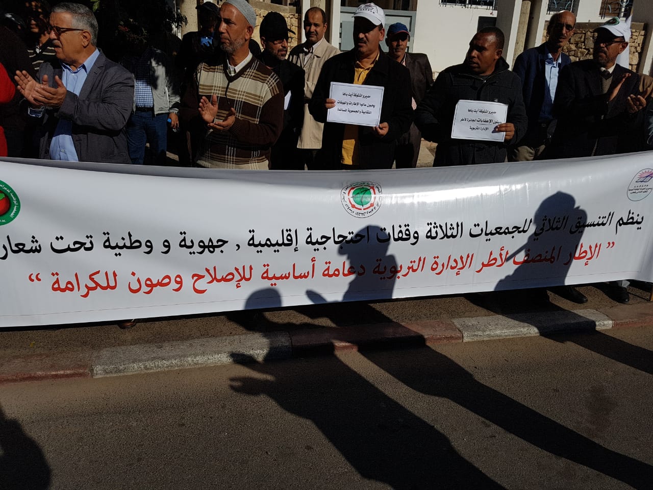 وكان مقرالأكاديمية الجهوية للتربية والتكوين بأكادير، قد عرف صباح يوم أمس الخميس 06دجنبر الجاري، توافد حشد كبير من أطر الإدارة التربوية، بجميع فئاتها، يمثلونالتنسيق الثلاثي للجمعيات الوطنية لأطر الإدارة التربوية بجهة سوس ماسة، المتكونمن الجمعية الوطنية لمديرات ومديري الثانويات العمومية بالمغرب، الجمعية الوطنيةلمديرات ومديري التعليم الابتدائي بالمغرب والجمعية الوطنية للحراس العامينوالنظار ورؤساء الأشغال ومديري الدراسة، قادمين من مختلف مدن الجهة، ليلتئم شملهمفي وقفة احتجاجية صاخبة أمام مقر الأكاديمية الجهوية للتربية والتكوينبأكادير، كآخر احتجاج إنذاري قبل نقل اعتصامهم أمام مقروزارة التربية الوطنية بالرياطنهاية الشهر الجاري.