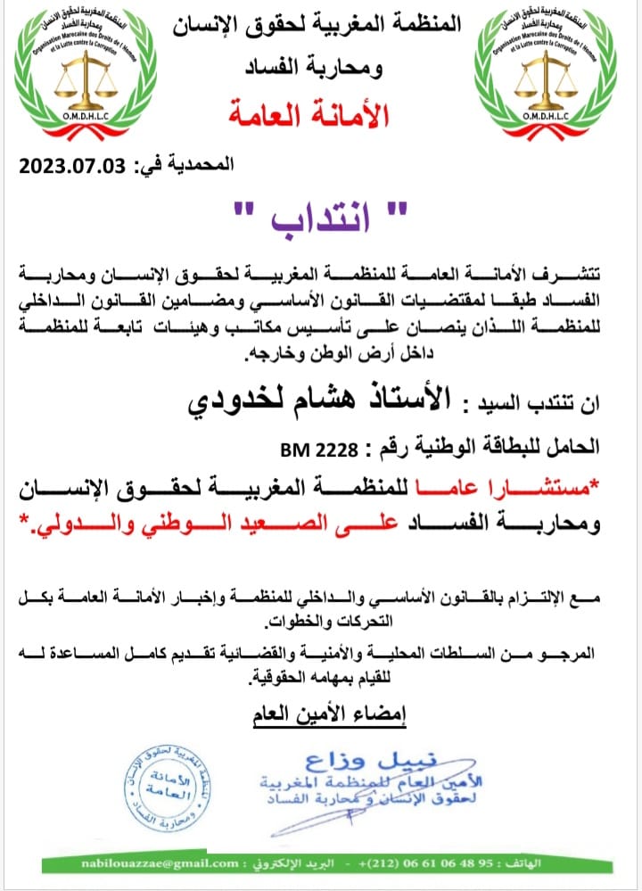 ينهي السيد نبيل وزاع الأمين العام للمنظمة المغربية لحقوق الإنسان ومحاربة الفساد إلى علم الجميع بأنه تم يوم الإثنين 03 يوليوز 2023 انتداب الأستاذ هشام لخدودي مستشارا عاما للمنظمة المغربية لحقوق الإنسان ومحاربة الفساد على الصعيد الوطني والدولي ، طبقا لمقتضيات الظهير الشريف 376-58-1 الصادر في 3 جمادى 1378 الموافق 15 نونبر 1958 يضبط بموجبه حق تأسيس الجمعيات.