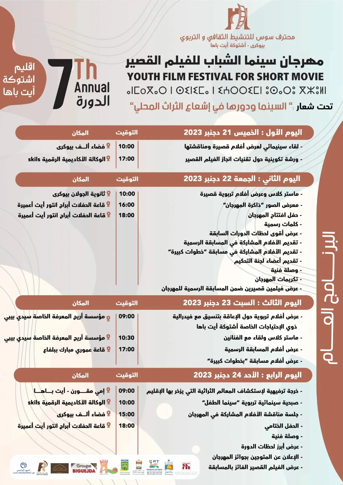 تحت شعار “السينما ودورها في الإشعاع التراثي باشتوكة أيت باها” ينظم محترف سوس للتنشيط الثقافي والتربوي بمدينة بيوكرى إقليم اشتوكة أيت باها النسخة السابعة لمهرجان سينما الشباب للفيلم القصير من الفترة الممتدة من 21 الى 24 دجنبر2023.