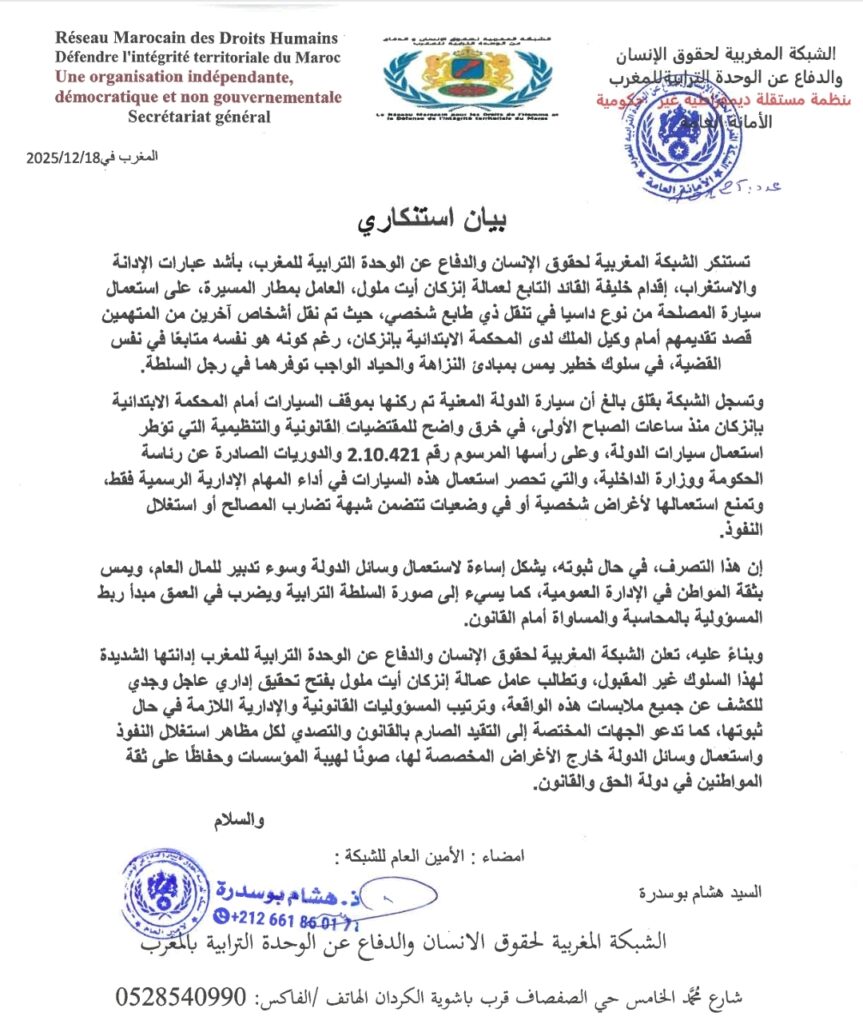 أصدرت الشبكة المغربية لحقوق الإنسان والدفاع عن الوحدة الترابية للمغرب بيانًا استنكاريًا، عبّرت فيه عن إدانتها الشديدة لما وصفته بسلوك خطير يمس مبادئ النزاهة والحياد المفترض توفرهما في رجال السلطة، وذلك على خلفية استعمال سيارة تابعة للدولة للتنقل في سياق مرتبط بقضية معروضة على أنظار القضاء بعمالة إنزكان أيت ملول.