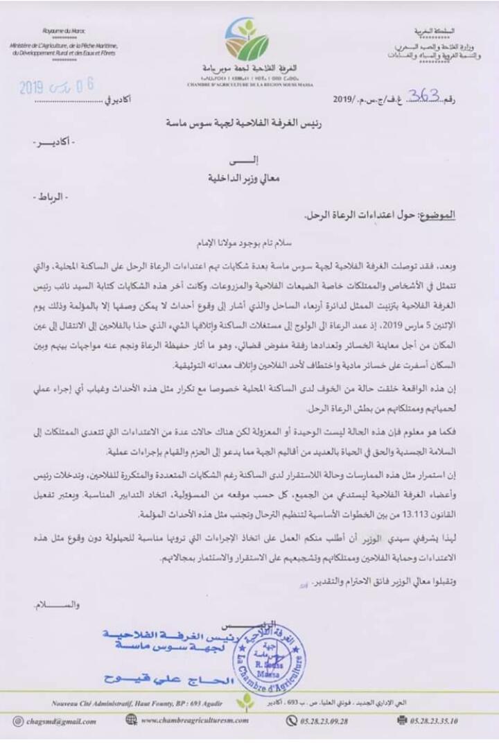 تفاعلا مع موجة الهجومات المتوالية للرعاة الرحل على ممتلكات الساكنة بالجهة، قام السيد الحاج علي قيوح رئيس الغرفة الفلاحية لجهة سوس ماسة بمراسلة كلا من وزيري الداخلية عبد الوافي لفتيت و الفلاحة عزيز أخنوش و والي الجهة يطالبهم بالتدخل قبل وقوع الكارثة بعد المواجهات الدامية بين الرعاة الرحل و عدد من الساكنة.