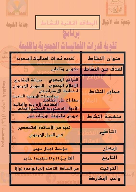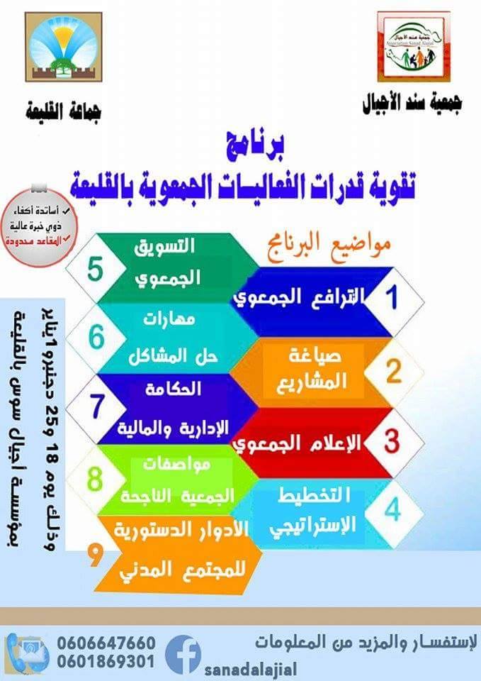في إطار تفعيل المقتضيات الدستورية الجديدة المرتبطة بالمجتمع المدني وخاصة ما يتعلق بأجرأة المقاربة التشاركية بين الفعاليات الجمعوية والمؤسسات المنتخبة والسلطات العمومية، واستهدافا لتطوير معارف ومهارات الفاعلين الجمعويين، تطلق جمعية سند الأجيال بشراكة مع جماعة القليعة برنامج تكويني:لدعم وتعزيز قدرات الجمعيات المهتمة بالشأن العام وتمكين أطرها من مهارات وتقنيات الترافع لدى السلطات العمومية والمنتخبة، وكذا دعم قدراتها في مجال صياغة المشاريع و تدبيرها، وذلك من خلال مجموعة من المحاور من أهمها: