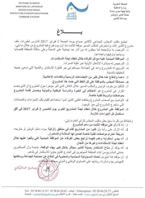 وخلال هذا الاجتماع أكد مكتب المجلس المسير لمدينة أكادير أن النقاش الذي أثير مؤخرا حول المشروع الذي يحسم القرار فيه الاحتكام إلى الخبرة والدراسة الوطنية والدولية وضمان إقامة المشروع بمواصفات وشروط تقنية خاصة .