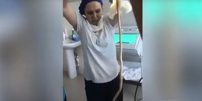 أظهر مقطع فيديو التقط في أحد المستشفيات الروسية إخراج أفعى بطول متر من فم سيدة تسللت إلى جوفها وهي نائمة.