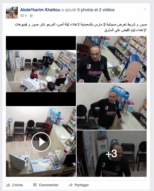 تداول نشطاء بالفيسبوك ليلة أمس الأربعاء صورا مرفقة بشريط فيديو يوثق للحظة تعرض صاحب صيدلية 3 مارس بمدينة المحمدية لاعتداء من طرف لص ، قبل أن يعمد هذا الأخير تحت تهديده لصاحب الصيدلية إلى سرقة ما تيسر له من أدوية ومواد طبية ، تم لاذ بعدها بالفرار .