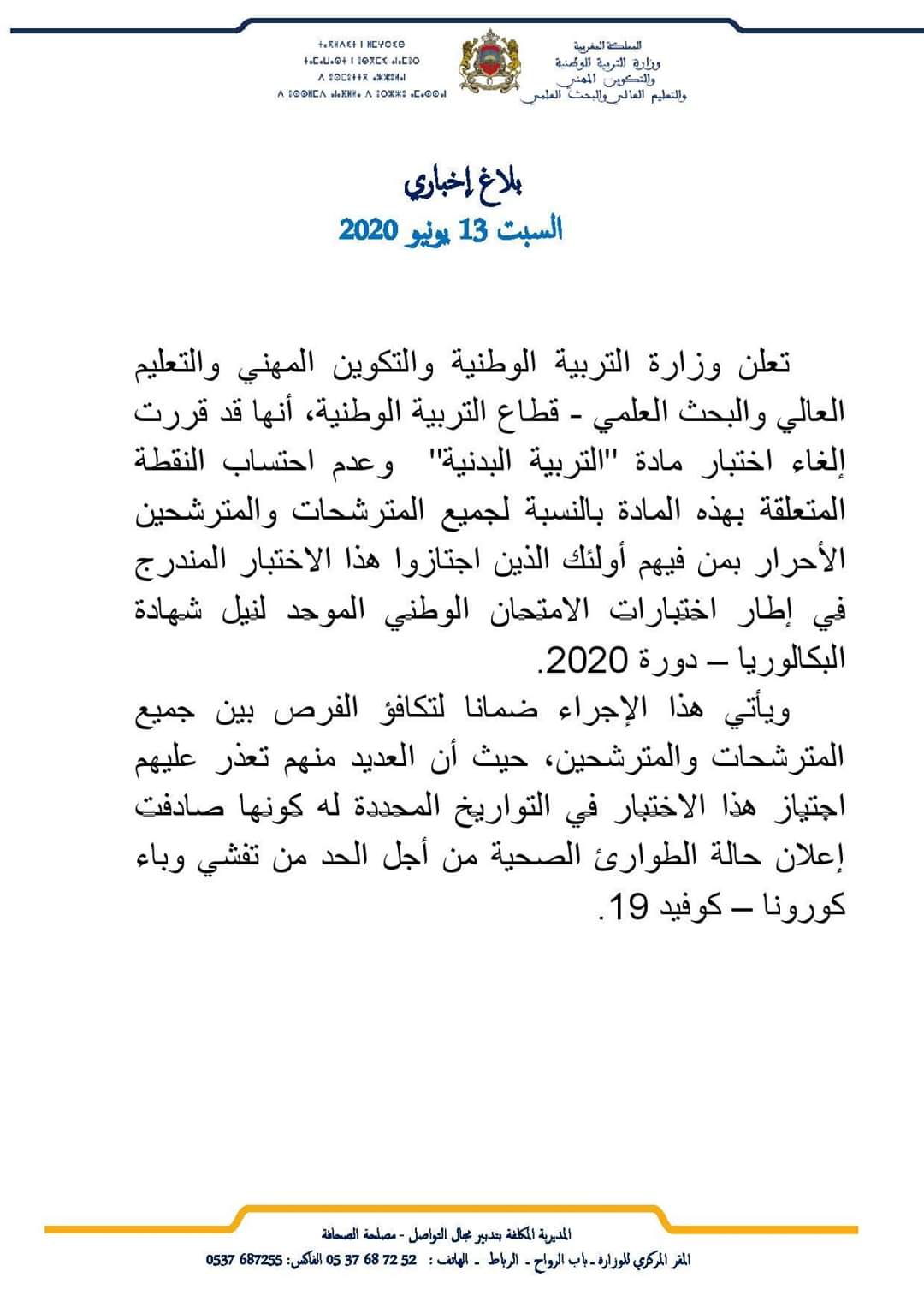 تعلن وزارة التربية الوطنية والتكوين المهني والتعليم العالي والبحث العلمي – قطاع التربية الوطنية، أنها قد قررت إلغاء اختبار مادة “التربية البدنية” وعدم احتساب النقطة المتعلقة بهذه المادة بالنسبة لجميع المترشحات والمترشحين الأحرار بمن فيهم أولئك الذين اجتازوا هذا الاختبار المندرج في إطار اختبارات # الامتحان الوطني الموحد لنيل شهادة البكالوريا – دورة 2020.