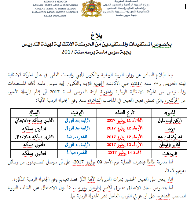 تبعا للبلاغ الصادر عن وزارة التربية الوطنية والتكوين المهني والبحث العلمي في شأن الحركة الانتقالية لهيئة التدريس برسم سنة 2017، تنهي الأكاديمية الجهوية للتربية والتكوين لجهة سوس ماسة لكافة المستفيدات والمستفيدين من الحركة الانتقالية الوطنية والجهوية لهيئة التدريس لسنة 2017 أن إتمام المرحلة الأخيرة من الحركتين، والتي تقتضي تعيين المعنيين في المناصب الشاغرة، ستتم وفق الجدولة الزمنية الآتية: