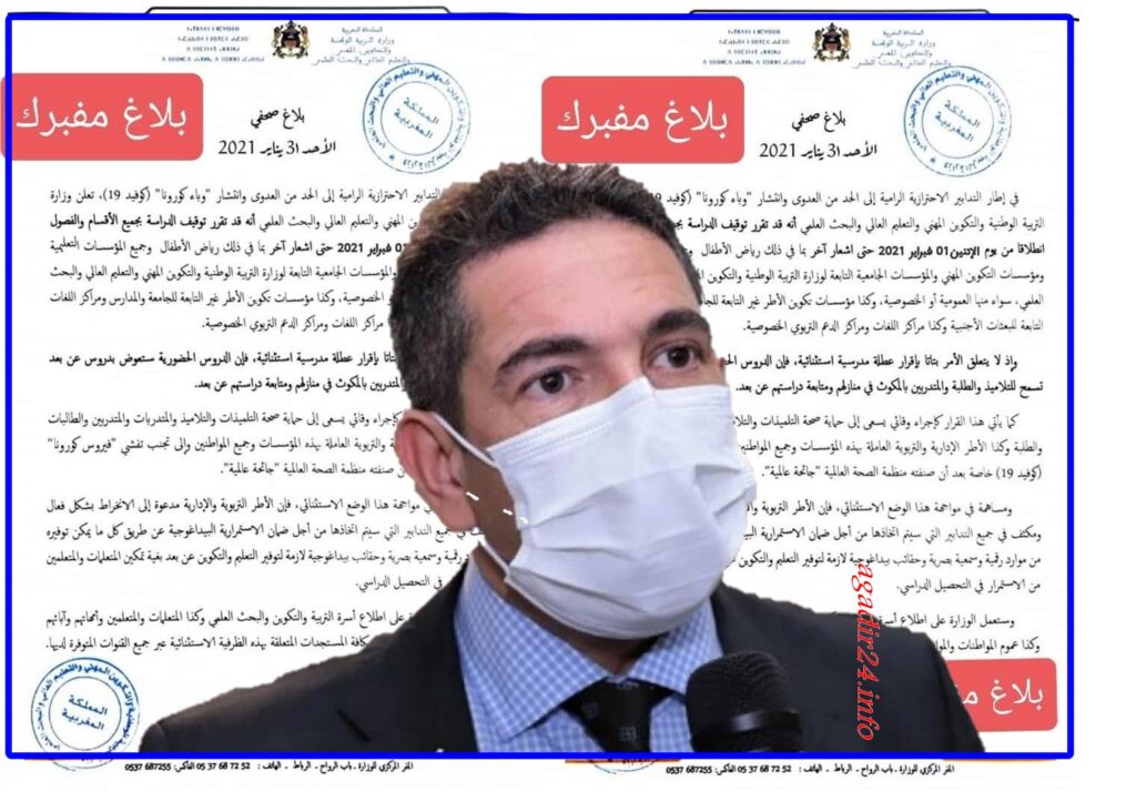 في هذا السياق، أكدت وزارة أمزازي في بيان حقيقة توصلت أكادير24 بنسخة منه، بان بعض الأشخاص عمدوا إلى تداول بلاغ مفبرك منسوب إلى وزارة التربية الوطنية والتكوين المهني والتعليم العالي والبحث العلمي بخصوص توقيف الدراسة بجميع الأسلاك والمستويات انطلاقا من يوم الاثنين 01 فبراير الحالي وحتى إشعار آخر وتنويرا منها للرأي العام الوطني والتعليمي فإن الوزارة تنفي نفيا قاطعا إصدار أي بلاغ بهذا الشأن كما تذكر التلاميذ والأسر على أن تستأنف الدراسة يوم الاثنين فاتح فبراير 2021.