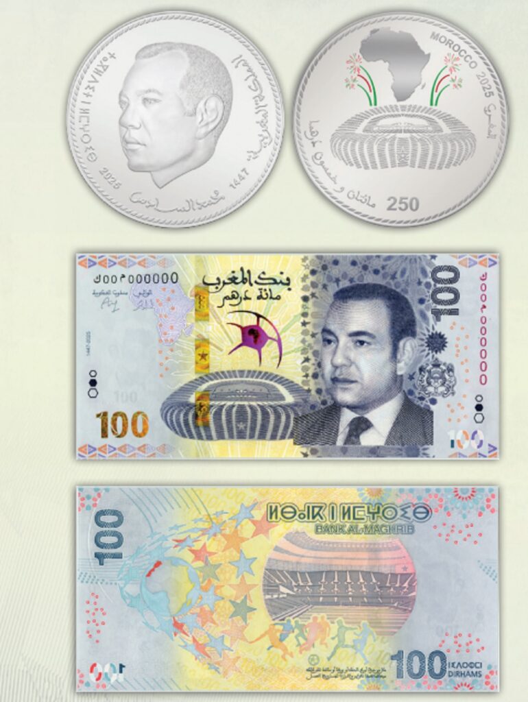 أعلن بنك المغرب، اليوم الإثنين 22 دجنبر 2025، عن إصدار قطعة نقدية تذكارية فضية من فئة 250 درهم، وطرح ورقة بنكية تذكارية من فئة 100 درهم، وذلك بمناسبة احتضان المملكة المغربية للدورة الخامسة والثلاثين من كأس أمم إفريقيا – المغرب 2025.