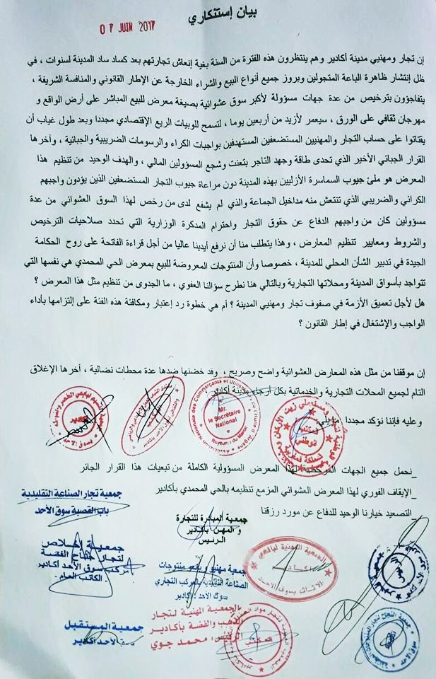 + بيان: مهنيو وتجار أكادير يعلنون الإنتفاضة ضد الترخيص لإقامة معرض الحي المحمدي.