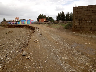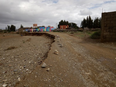 ولقد ازداد الخطر بانجرافات التربة بجانب ضفة سهب الخرواع ،حيث غمرت المياه الطرق ‘ولم يبقى يفصلها عن المازل الا حوالي مترين ،كما أن الوحدة المدرسية المتواجدة بالدوار مهددة هي الاخرى ،كما توضح الصورة.