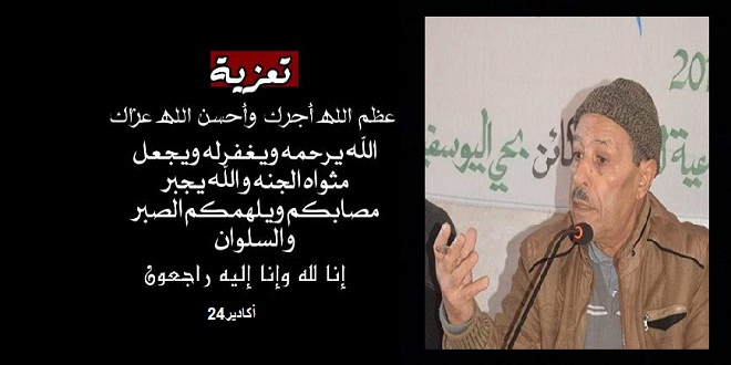 بعيون دامعة وقلوب خاشعة راضية بقضاء الله وقدره، تلقت جريدة “أكادير24” نبأ وفاة المرحوم والمغفور له بإذن الله، ٍ “محمد إديحيا” أحد قيدومي المنتخبين بتزنيت وعضو سابق بالجماعة الترابية بذات المدينة، و ذاكرتها .