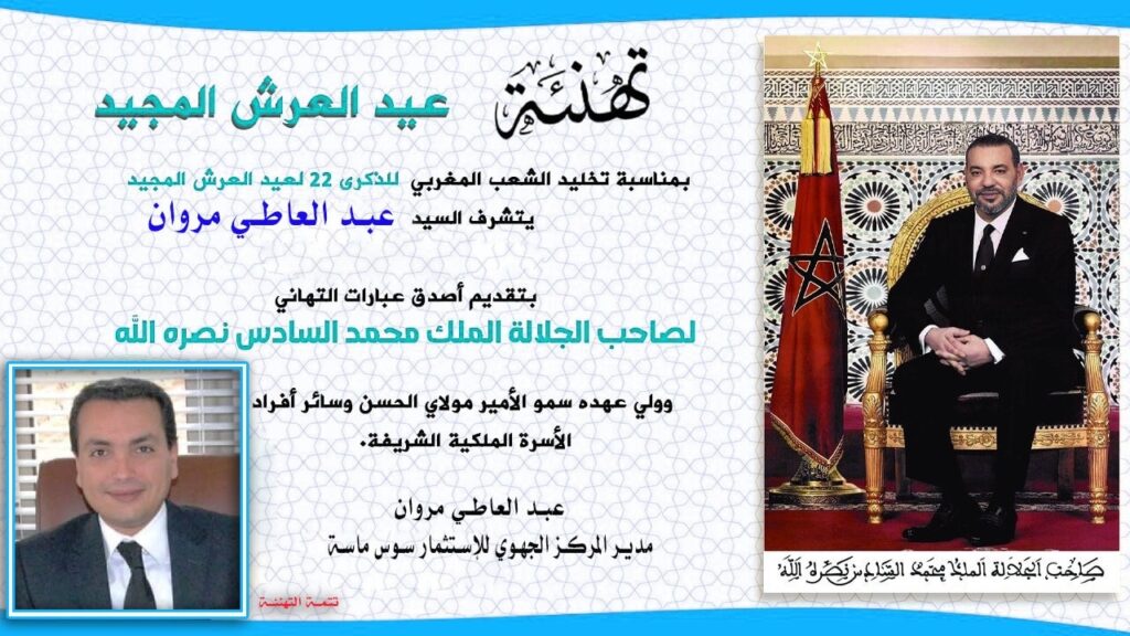 بمناسبة حلول عيد العرش المجيد الذي يخلد الذكرى الثانية والعشرين لاعتلاء جلالتكم عرش أسلافكم المنعمين، يتشرف خادم الأعتاب الشريفة، السيد: عبد العاطي مروان، مدير المركز الجهوي للاستثمار سوس ماسة، أصالة عن نفسه ونيابة عن باقي موظفي و مستخدمي المركز، بأحر التهاني وأسمى آيات الولاء والإخلاص لصاحب الجلالة الملك محمد السادس أيده الله ونصره، أبقاه الله ذخرا وملاذا للمغاربة والمغرب وضامنا لرقيه وازدهاره في كافة المجالات الاقتصادية والاجتماعية والثقافية …