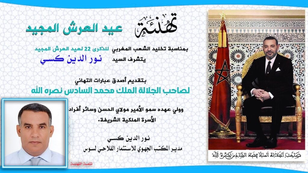 بمناسبة الذكرى الثانية والعشرين لتربع صاحب الجلالة الملك محمد السادس نصره الله عرش أسلافه الميامين، يتشرف السيد نور الدين كسي: مدير المكتب الجهوي للاستثمار الفلاحي لسوس ماسة، وبعد تقديم فروض الطاعة والولاء اللائقين بالمقام العالي بالله، أن يعبر لجلالة الملك محمد السادس، أصالة عن نفسه ونيابة عن كافة موظفي و مستخدمي المكتب، عن أزكى التهاني وأطيب الأماني مشفوعة بخالص الحب والولاء، سائلين العلي القدير أن يحقق على يديكم الكريمتين ما تتمنونه لشعبكم من عز ومجد، مع الدعاء لكم يا مولاي بدوام الصحة والسعادة.