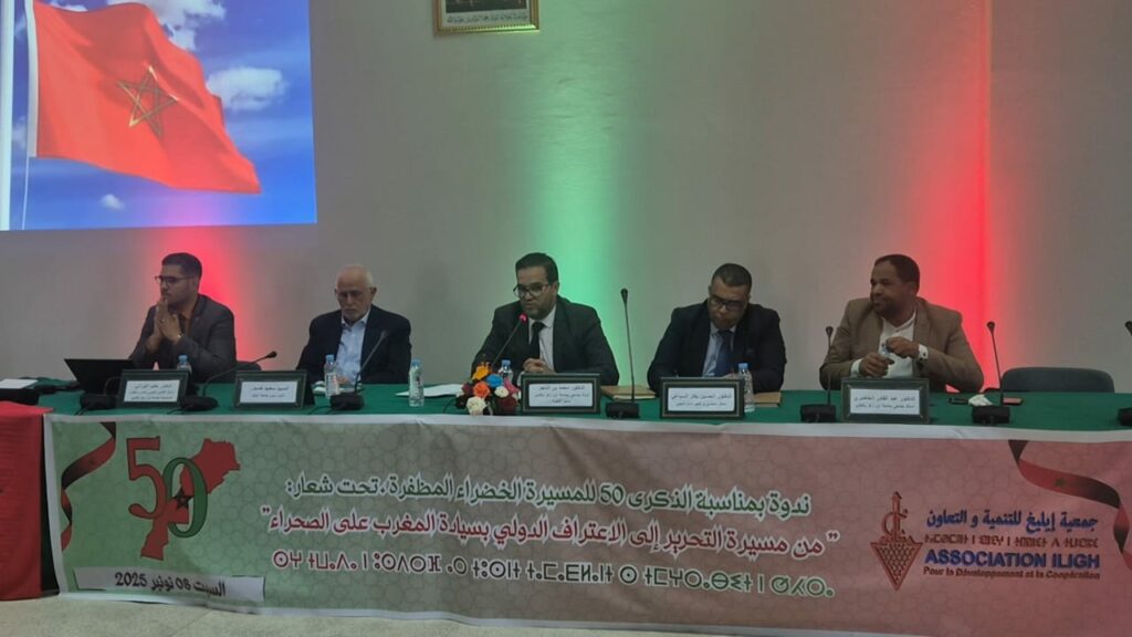 نظمت جمعية إيليغ للتنمية والتعاون في إطار الاحتفال بالذكرى الخمسين للمسيرة الخضراء المظفرة ندوة فكرية تحت شعار: “من مسيرة التحرير إلى الاعتراف الدولي بسيادة المغرب على الصحراء”، وذلك بحضور نخبة من الأساتذة والباحثين الجامعيين المختصين في الشأن السياسي والقانوني والدولي.