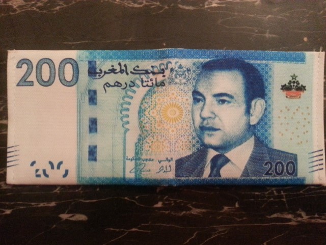 أقدم بعض الباعة الجائلين بشوارع بني ملال على عرض محفظات جيبية مصنوعة من البلاستيك بالدار البيضاء ، ومطبوعة بطريقة محترفة بنسخ أوراق من فئة 100 و200 درهم ، حيث تثير فضول المواطنين الذين لا يفوتون فرصة افتحاصها والسؤال عن ثمنها الذي لا يتجاوز 20 درهم للواحدة .