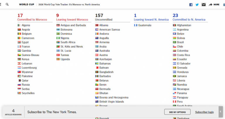 قامت صحيفة « نيويورك تايمز » الأمريكية بكشف عدد الدول التي من المنتظر أن تصوت لصالح الملف المغربي أو الملف المشترك بين الولايات المتحدة الأمريكية وكندا والمكسيك لتنظيم كأس العام لكرة القدم لسنة 2026.