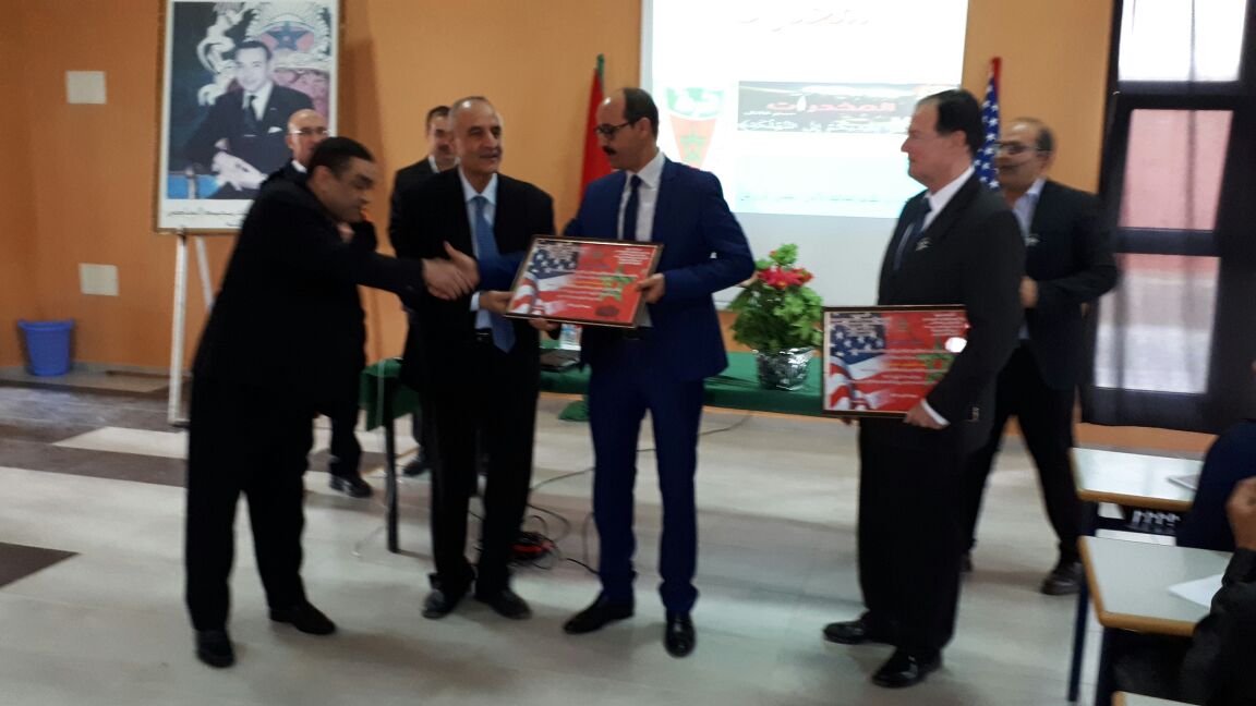 وقد خصص رئيس المنطقة الإقليمية للأمن بتزنيت الوفد الأمني الأمريكي، الذي كان مرفوقا بمسؤول بالسفارة الامريكية بالرباط، باستقبال تم خلاله تبادل الكلمات والهدايا الرمزية بين الطرفين، قبل أن يتوجه الجميع إلى الثانوية التأهيلية “أرگان” لحضور عرض تحسيسي حول مخاطر المخدرات وسبل الوقاية منها، ألقاه ضابط مسؤول عن الخلية المحلية للتحسيس بالوسط المدرسي بالمنطقة الإقليمية لتزنيت.