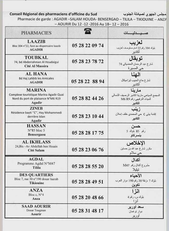 فيما يلي لائحة صيدليات الحراسة بأكادير ومحيطها، خلال الفترة الممتدة ما بين 12 إلى 18 دجنبر 2016.
