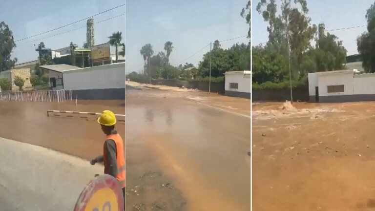 وتداول نشطاء على مواقع التواصل الاجتماعي مقطع فيديو يوثق انهمار المياه على مقربة من دوار البراكيك لتغطي شارعا حيويا بأكمله إضافة إلى أزقة مجاورة له.