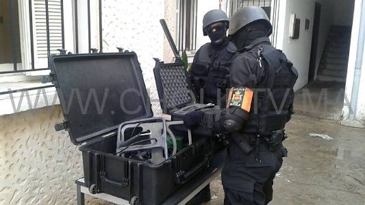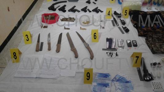 وأوضحت وزارة الداخلية في بلاغها بأن هذه العملية الأمنية، أفضت عن رصد مخبأ سري أعده العقل المدبر لهذه الشبكة الإرهابية بالجديدة للتحضير لعمليات إرهابية نوعية بالمملكة بإيعاز من قادة ميدانين ل”داعش”بكل من الساحة السورية العراقية وليبيا، حيث تم حجز أسلحة نارية عبارة عن مسدس رشاش مزود بمنظار ليلي يعمل بالأشعة الحمراء، و7مسدسات وكمية وافرة من الذخيرة الحية، و4 سكاكين كبيرة الحجم،وجهازين للاتصالات اللاسلكية،بالإضافة إلى سراويل عسكرية وعصي تلسكوبية ومعدات ومواد كيميائية وسوائل مشبوهة يحتمل استعمالها في صناعة المتفجرات، وكذا سترتين مزودتين بحزامين ناسفين. هذه المواد المشبوهة سيتم إخضاعها للخبرة بمختبر الشرطة العلمية والتقنية لتحديد طبيعتها.