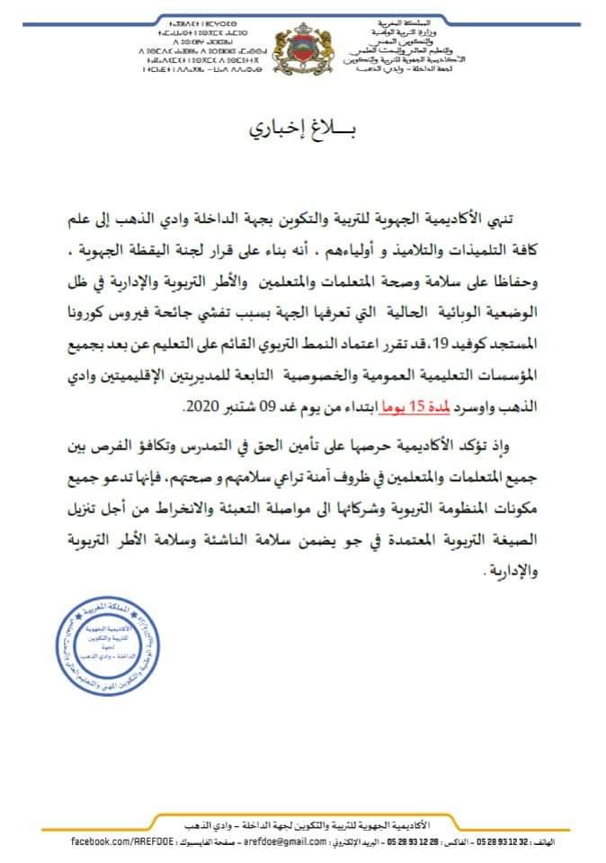 قررت الأكاديمية الجهوية للتربية والتكوين لجهة الداخلة واد الذهب اعتماد التعليم عن بعد بالمديريتين الإقليميتين واد الذهب و أوسرد لمدة 15 يوما ابتداء من يوم غد الأربعاء 9 شتنبر 2020.