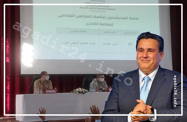 انتخب عزيز أخنوش وكيل لائحة حزب التجمع الوطني للأحرار رئيسا للجماعة لأكادير بعد حصوله على الأغلبية المطلقة من الأصوات، خلال انعقاد جلسة تشكيل مكتب المجلس الجماعي صبيحة اليوم الجمعة 24 شتنبر 2021.