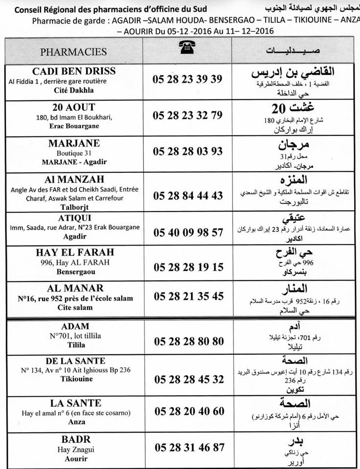 فيما يلي لائحة صيدليات الحراسة بمدينة أكادير ومحيطها، خلال الفترة الممتدة ما بين 05 و 11 دجنبر 2016.