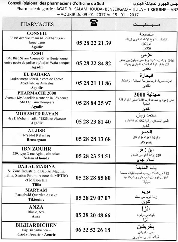 لائحة صيدليات الحراسة بأكادير ومحيطها،ما بين 09 يناير إلى 15 يناير 2016 أكادير والجهات أحمد ازاهدي الثلاثاء 10 يناير 2017 - 10:25 فيما يلي لائحة صيدليات الحراسة بمدينة أكادير ومحيطها، خلال الفترة الممتدة ما بين 09 يناير إلى 15 يناير 2016 شارك هذا المحتوى فيسبوك X واتساب تلغرام لينكدإن نسخ الرابط