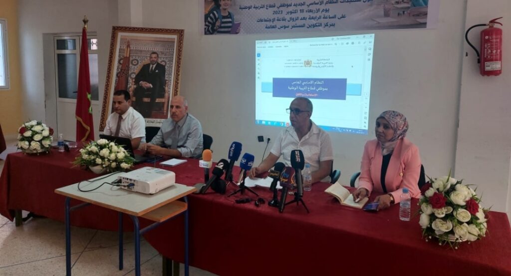على غرار عدد من المديريات الاقليمية لوزارة التربية الوطنية التي أطرت لقاءاتها حول مستجدات النظام الأساسي الجديد لموظفي قطاع التربيةالوطنية، نظمت المديرية الإقليمية بتارودانت بدورها ندوة صحفية مساء يوم الأربعاء 18 أكتوبر 2023 بقاعة الاجتماعات بمركز التكوين المستمر سوس العالمة بمدينة تارودانت.