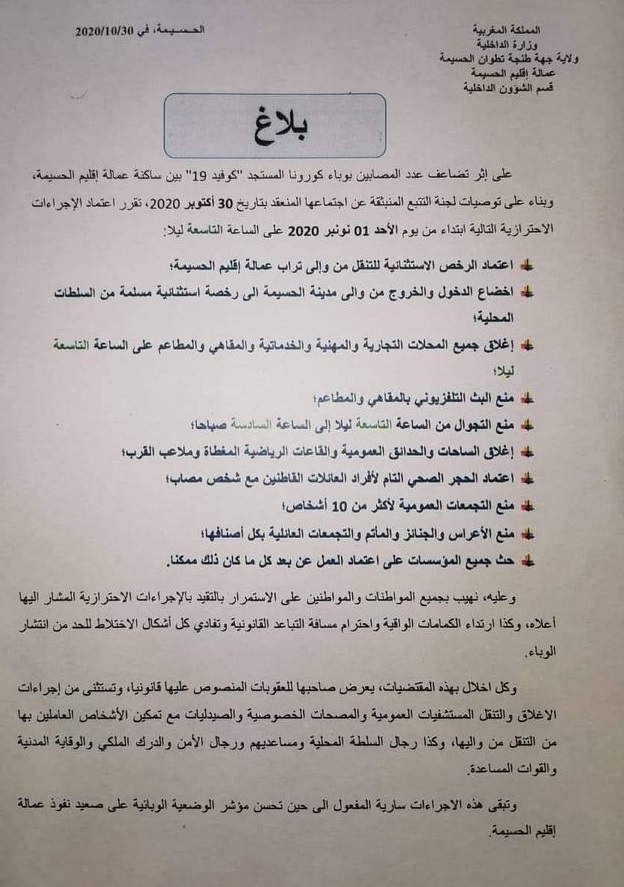 يتعلق الأمر بمدينة الحسيمة، التي أعلنت سلطاتها المحلية اعتماد إجراء ات احتراية جديدة ابتداء من يوم الأحد 01 نونبر 2020، بناء على توصيات لجنة التتبع بعد اجتماعها المنعقد بتاريخ 30 أكتوبر 2020 .