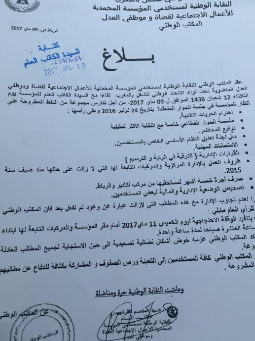 نظم المكتب الإقليمي للنقابة الوطنية لمستخدمي المؤسسة المحمدية للأعمال الاجتماعية لقضاة وموظفي العدل المنضوية تحت لواء الاتحاد الوطني للشغل بالمغرب صباح اليوم 11ماي2017 وقفة احتجاجية أمام المركب الاصطيافي لوزارة العدل الكائن بحي فونتي احتجاجا على التماطل الذي تنهجه المؤسسة في الاستجابة لمطالب المستخدمين وفي مقدمتها تعديل النظام الأساسي ومأسسة الحوار القطاعي ومعالجة الوضعية الادارية والمالية للمستخدمين وتحسين ظروف العمل بمراكز الاصطياف….
