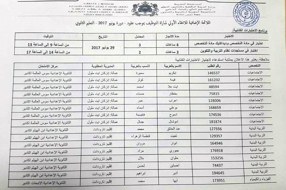 لائحة إضافية المترشحين الذين تم انتقاؤهم لاجتياز مباريات التوظيف بموجب عقود بجهة سوس ماسة.