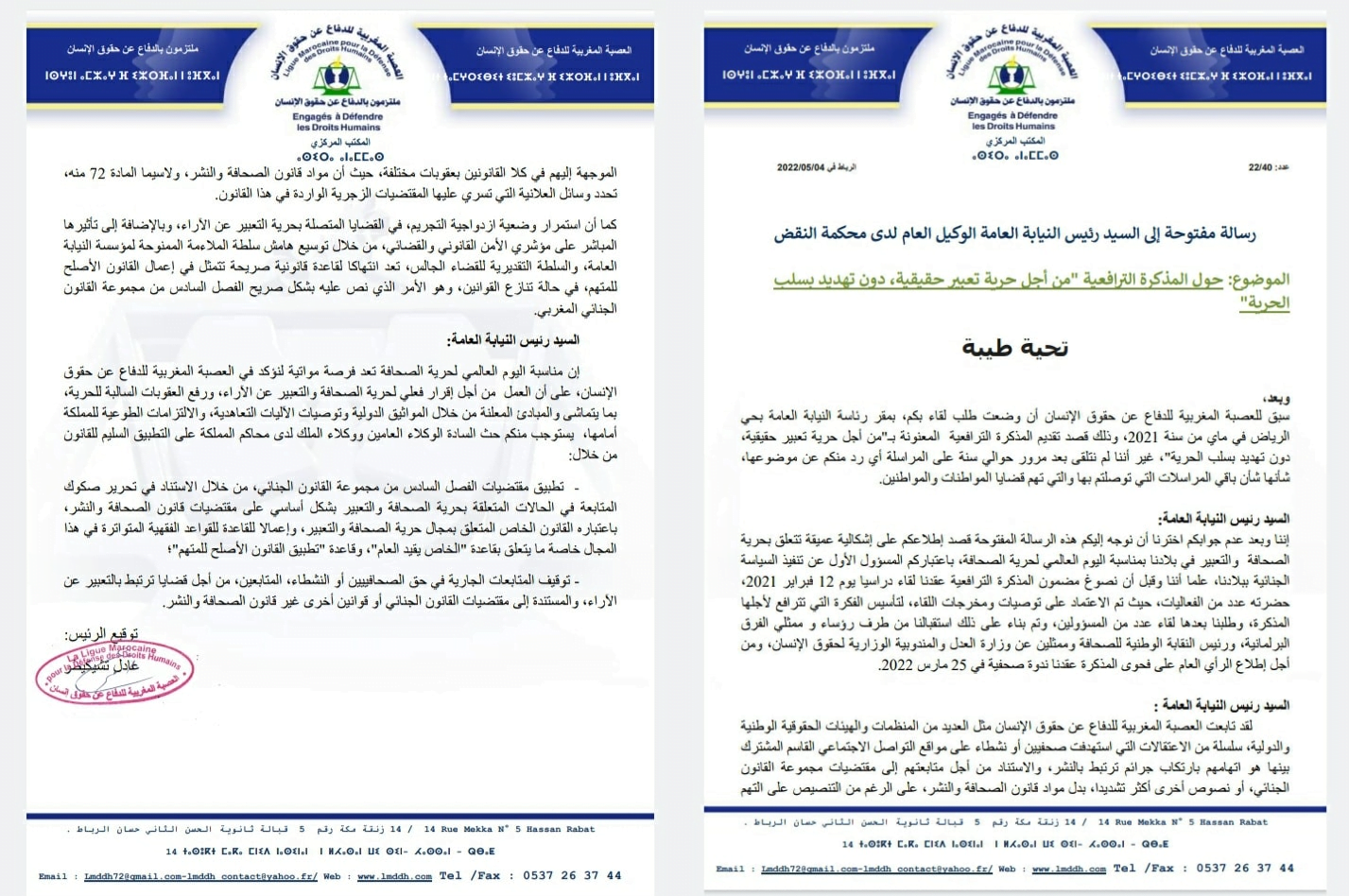 وجهت العصبة المغربية للدفاع عن حقوق الإنسان رسالة مفتوحة إلى السيد رئيس النيابة العامة الوكيل العام لدى محكمة النقض حول مذكرتها الترافعية بعنوان “من أجل حرية تعبير حقيقية، دون تهديد بسلب الحرية”، نبهت فيها إلى الإشكالية المتعلقة بـ”سلسلة من الاعتقالات التي استهدفت صحفيين أو نشطاء على مواقع التواصل الاجتماعي، القاسم المشترك بينهم هو اتهامهم بارتكاب جرائم ترتبط بالنشر، والاستناد من أجل متابعتهم إلى مقتضيات مجموعة القانون الجنائي، أو نصوص أخرى أكثر تشديدا، بدل مواد قانون الصحافة والنشر”.