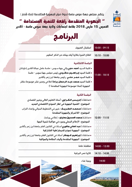 يذكر أن الندوة الوطنية، الجهوية المتقدمة بأكادير التي ينظمها مجلس جهة سوس ماسة تأتي في سياق تكريس جهود التواصل مع مختلف الفعاليات بالجهة و تماشيا مع ورش تنزيل أمثل للجهوية المتقدمة، كما تأتي ايضا ضمن سلسلة ندوات عبر جهات المملكة تحط الرحال بمحطتها الثانية بجهة سوس ماسة.